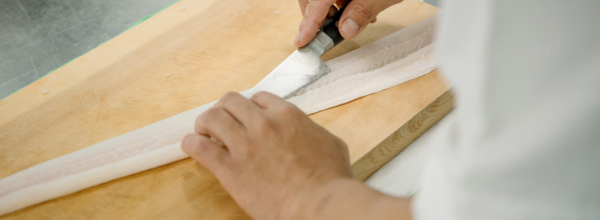 試験内容は、新技法の実技試験です。三枚におろした鱧の片身を、20分以内にフィーレにしてください。